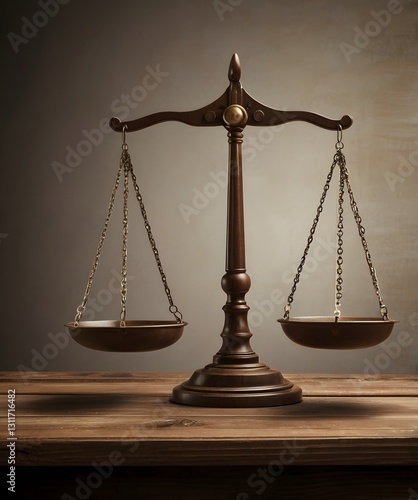 Scales of justice balancing on wooden table representing law and order
