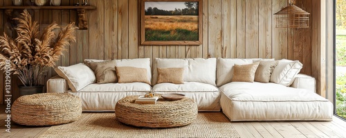 Scandinavian farmhouse interior design showcasing a stylish room with modern furniture sofa against a beautifully designed wall creating a cozy home background atmosphere