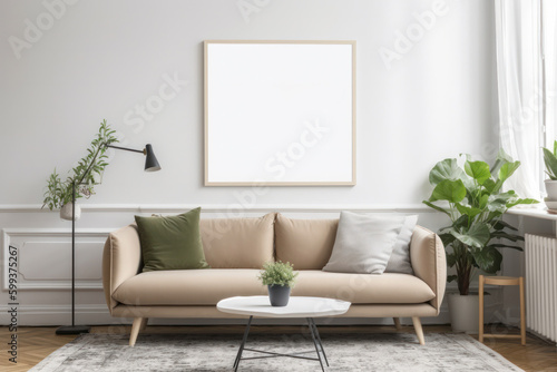 Scandinavian Living Room with Blank Horizontal Poster Frame and Botanical Accents