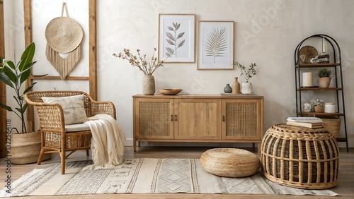Scandinavian-inspired console with light wood finish, minimalist art, natural elements, and soft, airy lighting.