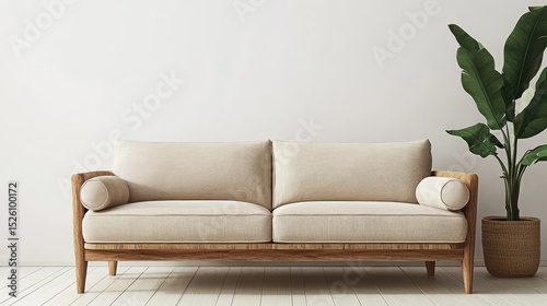 Scandinavian-style minimalist sofa in warm neutral color on clean wooden floor