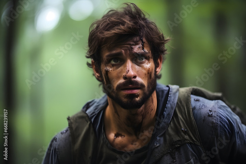 scared Caucasian young adult man lost in forest at summer day. Neural network generated image. Not based on any actual person or scene.