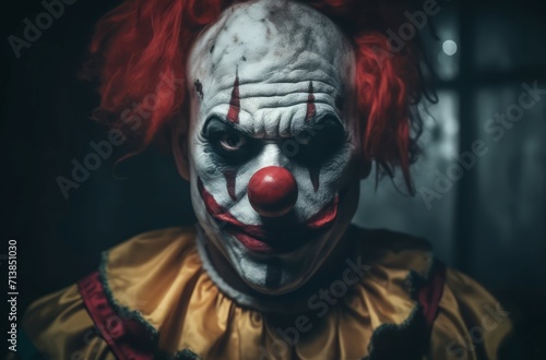 Scary clown mask. Horrible and frighten human with ugly yellow costume. Generate AI