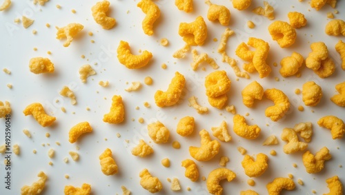 Scattered Cheese Puffs and Crumbs on a Light Background Creating a Playful Food Scene