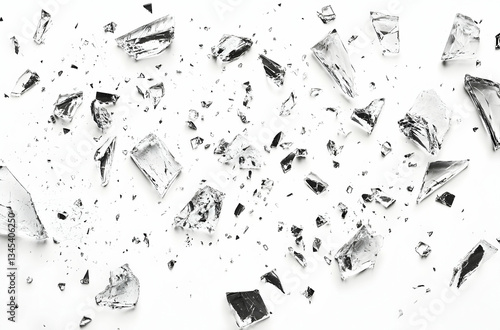 Scattered Clear Glass Fragments Reflecting Light on a White Background