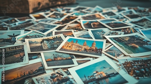 Scattered travel photos evoke nostalgic travel memories, capturing diverse landscapes and experiences.