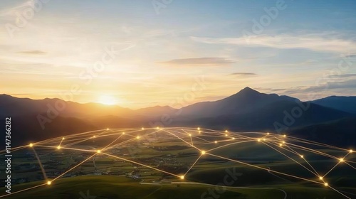 Scene is serene and peaceful, as the sun sets over the mountains