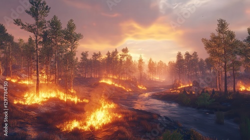 scene showing how a forest fire moves across the landscape, leaving scorched earth in its wake