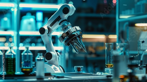 Scene shows a futuristic artificial intelligence robot arm manipulating a metal object, picking it up and placing it down in a modern chemistry lab.