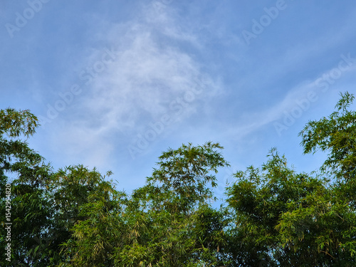 Scenery of Bamboo forest in summer in the blue sky background. Copy space