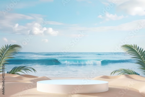Scenic beach backdrop with clear skies, ocean waves, and a white platform surrounded by palm leaves, perfect for presentations and displays.