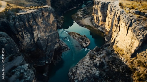 Scenic canyon landscape, majestic cliffs surrounding turquoise water, nature's beauty, ideal for outdoor adventure themes, copy space.