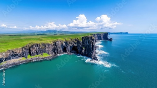Scenic coastal cliffs with turquoise waters and lush greenery.