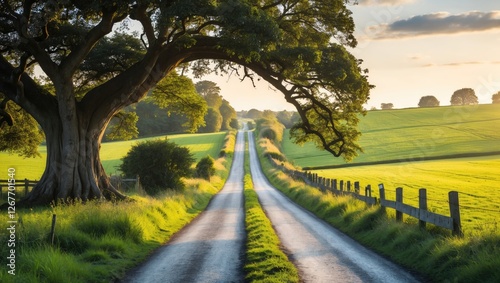 Scenic country road under the arching tree with lush green fields at sunset Copy Space