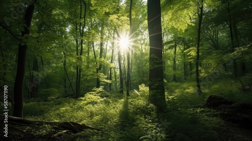 Scenic forest of fresh green deciduous trees framed by leaves, with the sun casting its warm rays through the foliage, generative ai