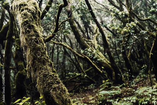 Scenic green forest background. Beautiful nature scenery with trees and trunks with musk. Woods. Explore and adventure concept. Creepy park with dark shadows. Amazing natural planet earth