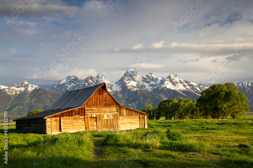 Scenic landscape image of the Moulton Barn with storm clouds, Grand Teton National Park, Wyoming.