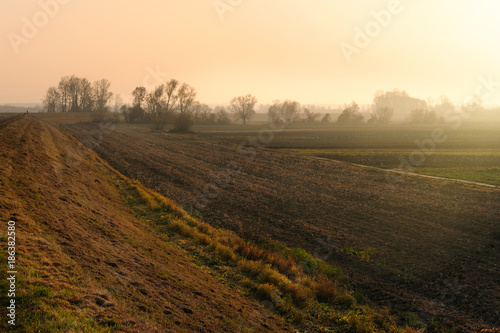 Scenic landscapes of agricultural meadow in dusk light. Vintage toned. Polaroid filter applied.