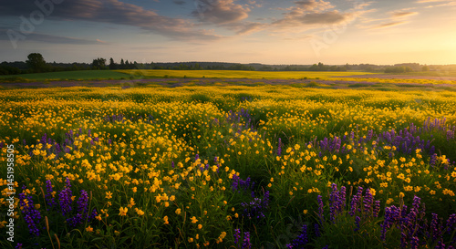 Scenic Meadow At Sunset Showcasing Yellow And Purple Wildflowers
