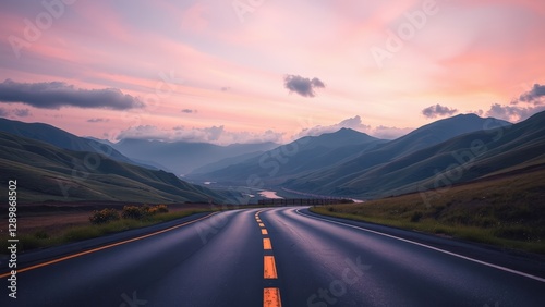Scenic Mountain Road at Dusk with Vibrant Sunset Colors and Rolling Hills
