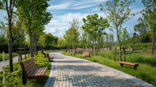 Scenic park path lined with benches and lush green trees, creating a peaceful and inviting atmosphere.