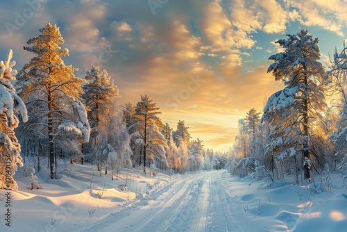 Scenic snowy forest road at sunset pine trees winter wonderland Christmas vacations nature off road village