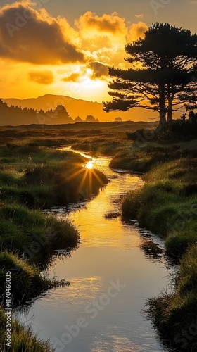 Scenic sunset over a tranquil stream with vibrant golden hues and silhouettes of trees.
