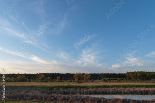 Scenic sunset over the meadow and forest in spring