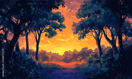 Scenic sunset pathway through forest glade with lush trees and vibrant sky vector