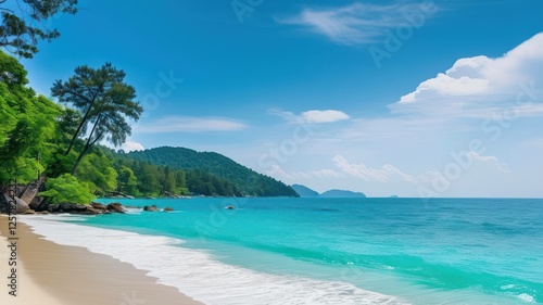 Scenic tropical beach with clear turquoise water, gentle waves, and lush green trees under a bright blue sky