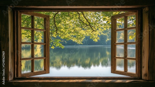 Scenic View of Calm Lake with Lush Greenery Framing Window