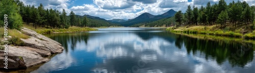 Scenic view of lake in pine forest with mountain and park concept. Serene lake surrounded by lush forests and majestic mountains.