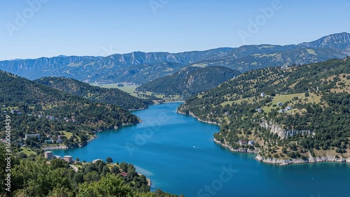 Scenic view of Lake Serre-Poncon surrounded by lush hills and mountains under clear blue skies in a nature setting.