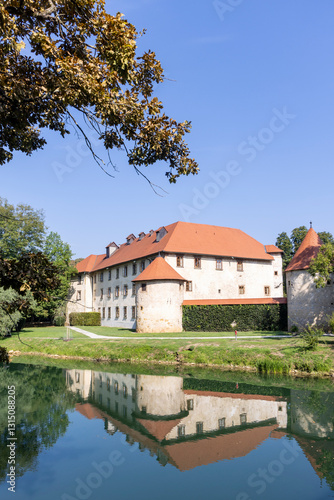 Scenic view of Otocec Castle at small island in Krka river in Slovenia