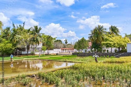 Scenic view of rice paddy fields with palm trees on a rice farm in Langkawi, Kedah, Malaysia.