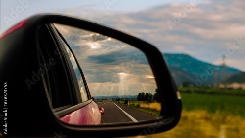 Scenic view of sunset highway reflected in car side mirror during road trip through countryside with dramatic clouds and soft sun rays