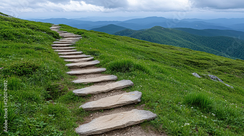 Scenic view of winding stone path through lush green hills and mountains
