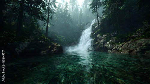 Scenic waterfall cascading into a serene pool surrounded by lush greenery and trees, capturing nature's beauty and tranquility.
