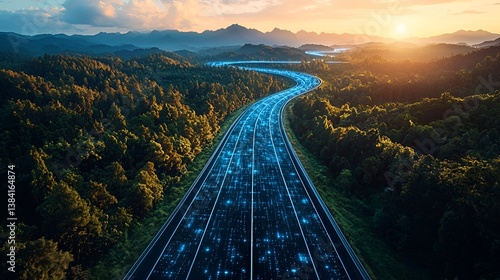 Scenic winding road through lush forest at sunset, illuminated with digital data streams.