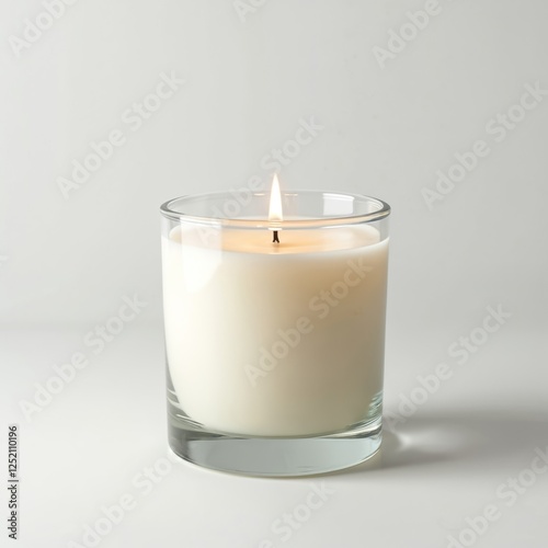 Scented candle in glass jar mock up. Aroma therapy with natural essential oils, warm light flame for relaxation. Spa wellness treatment for health, cozy interior, aromatherapy product sample on clear