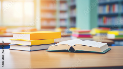 School book on table in classroom. Books on table in school classroom