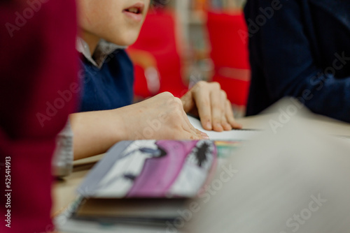 school children in the library reading books, doing homework, prepare a school project for lessons