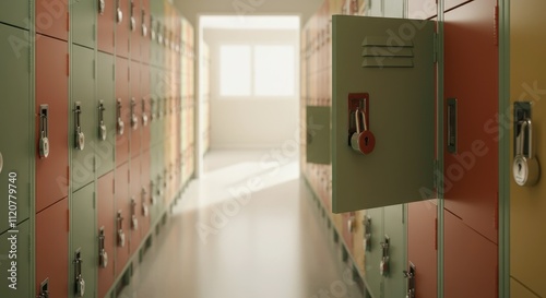 School hallway with open lockers, natural light streaming in