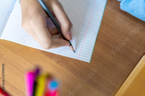 schoolgirl doing homework with pencil on paper, back to school comcept