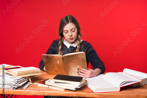 Schoolgirl teen sitting at the table reading a book, concept learning at home, homework