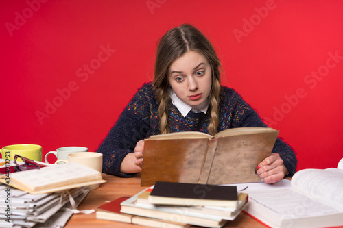 Schoolgirl teen sitting at the table reading a book, concept learning at home, homework