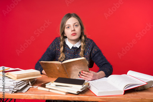 Schoolgirl teen sitting at the table reading a book, concept learning at home, homework