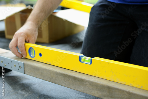 Schreiner oder Handwerker misst Holzbalken mit Wasserwaage auf Baustelle