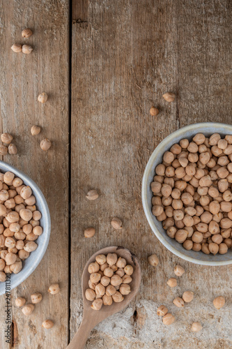Schüsseln mit getrocknete Kichererbsen auf einem alten Holzhintergrund