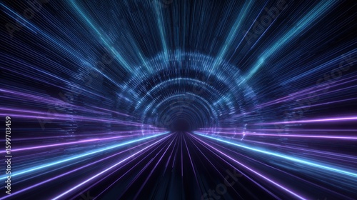 Sci - fi inspired neon tunnel with blue and purple light streaks, evoking a sense of speed, motion, and high - tech adventure in a digital universe.